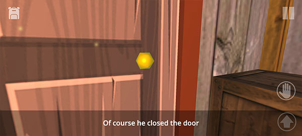 6、发现被关起来了,移动到门口点击手掌,可以触发动作,门打不开,需要另寻出路。